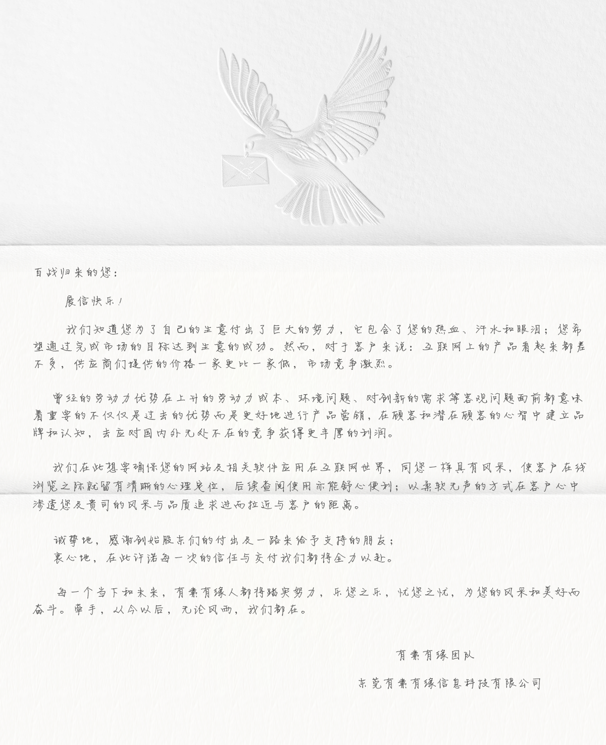 东莞有素有缘信息科技有限公司成立于2015年8月21日,前身是东莞境通机械有限公司,当时的我们主要为有发展外贸需求的机械行业公司提供网络搭建、翻译等服务。2017年12月中旬,我们开始了新的尝试。希望在人生这场单程旅行中,可以帮助到更多有需要的人。